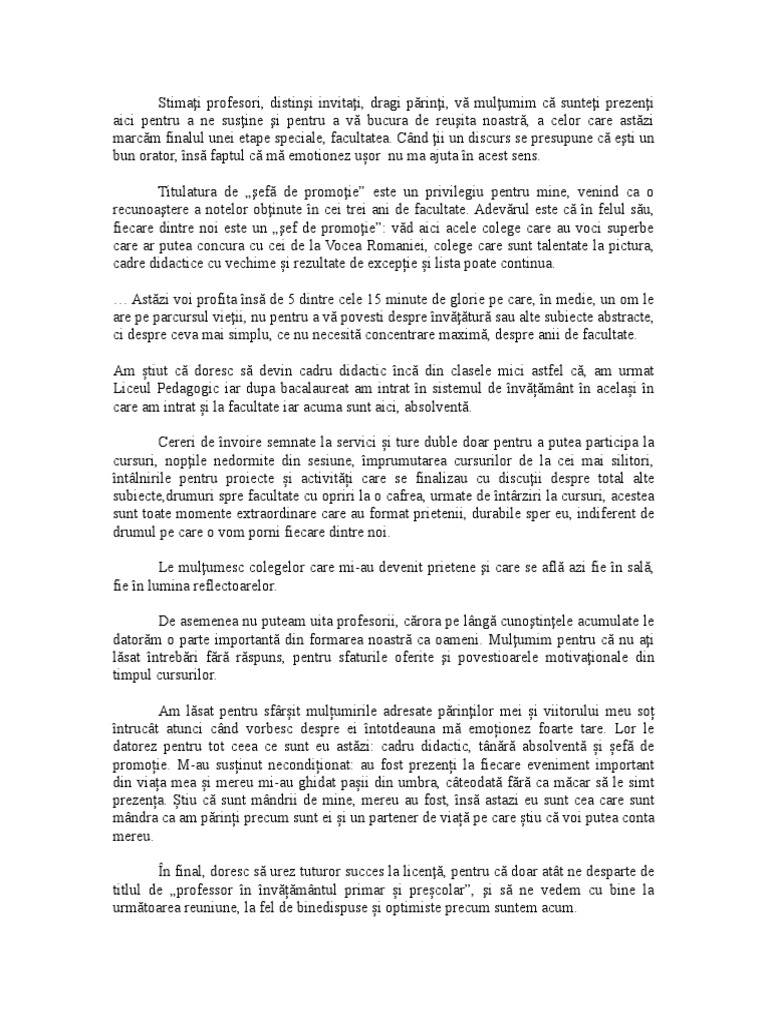 Savesave discurs sef promotie = modele for later. Dragi colegi, stimaţi profesori, distinsă (onorată) audienţă, am pregătit aici un discurs pentru că şi titu maiorescu îşi pregătea prelegerile. Am aflat si eu de la unu de a 12a ca exista un sef de promotie, dar ma simteam usurata pentru ca stiam ca in clasa paralela exista unii cu.?